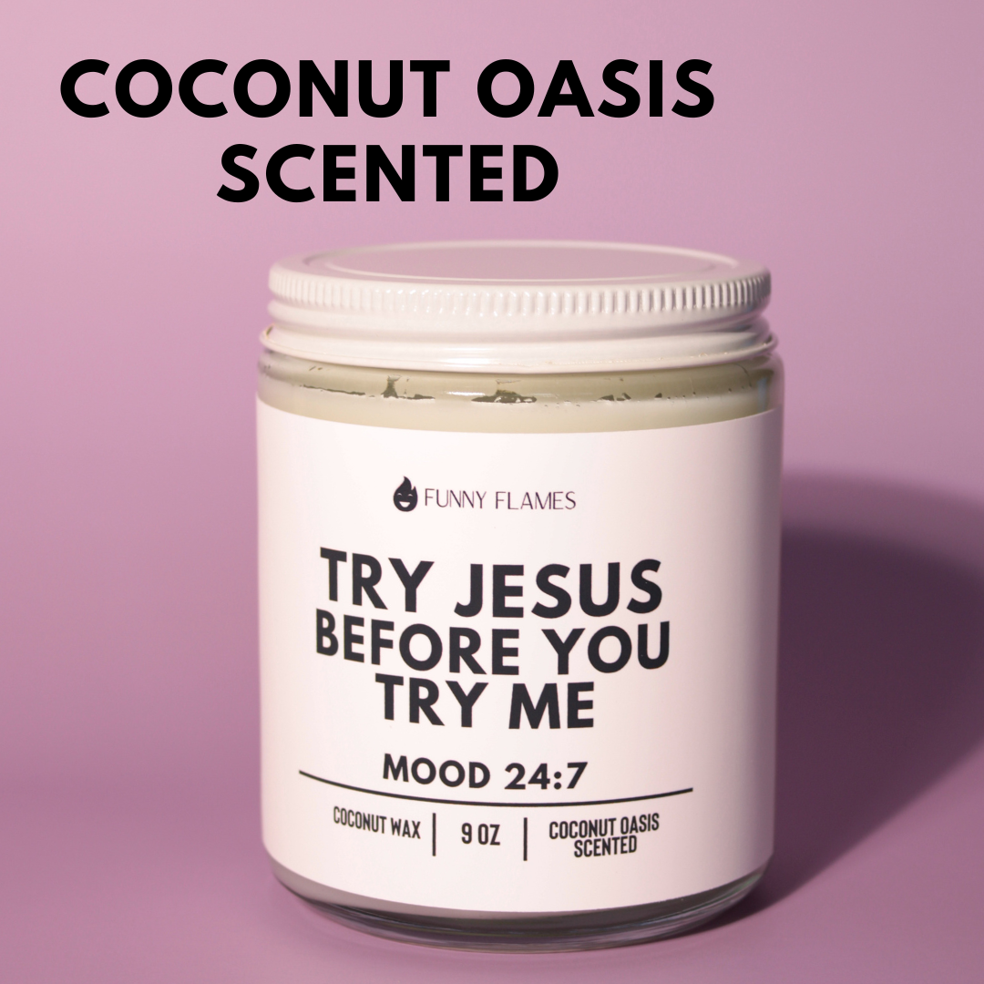 "Try Jesus Before You Try Me" scented candle – a playful yet powerful expression of patience and resilience. Infused with the serene aroma of coconut oasis, this candle transports you to a tranquil haven where worries fade away. As you light its flame, let the soothing fragrance wrap you in a sense of calm, creating an oasis of peace. The lighthearted message on the label reflects the sentiment of seeking inner harmony. Whether you're navigating challenging interactions or simply seeking solace, this candle serves as a reminder to choose a path of patience and understanding. Allow the comforting scent to guide you towards a place of tranquility, where grace and compassion prevail.